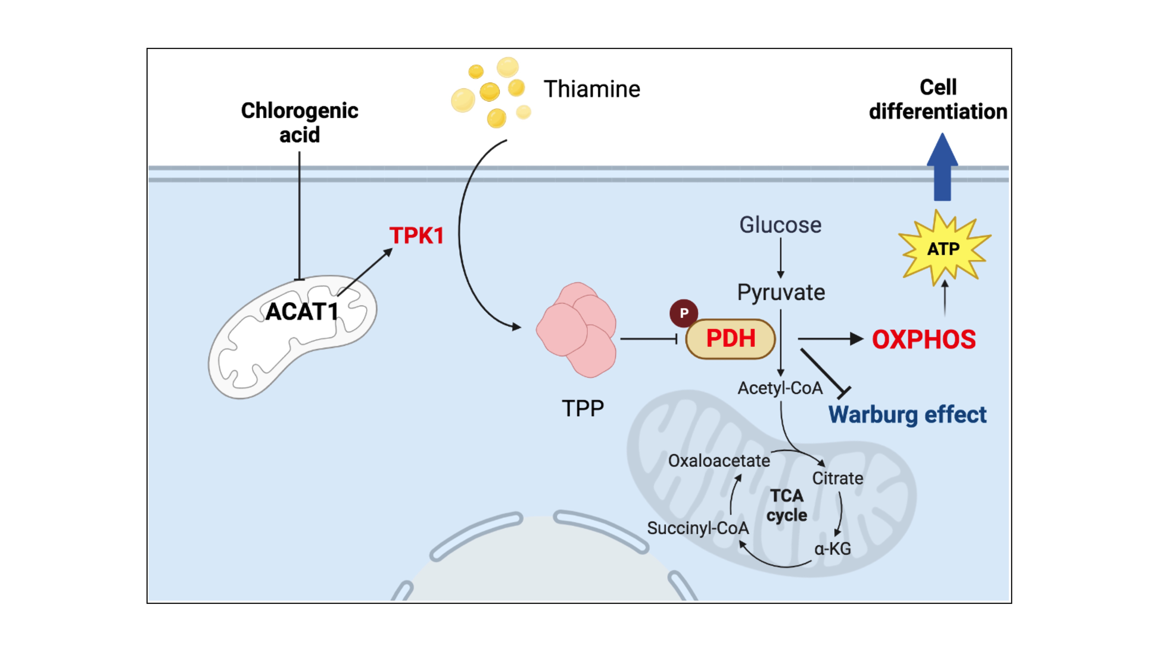 3、硫胺素代謝途徑在ACAT1介導(dǎo)的分化中起重要作用。CHA和ACAT1敲除均上調(diào)了TPK1表達(dá),激活了硫胺素代謝途徑,增強(qiáng)了PDH酶活性。