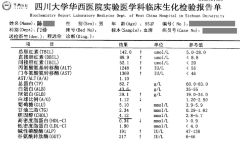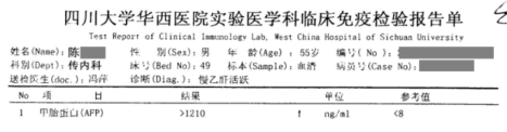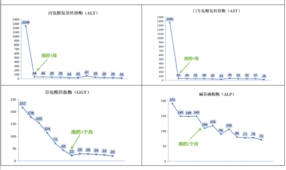 患者用藥前影像學檢查報告顯示肝多發(fā)囊腫,甲胎蛋白(AFP)高達1210ng/ml(大面積肝壞死),醫(yī)院建議必須換肝,而且還不能保證患者是否可以獲得有效治療。 患者未采用手術(shù),隨后5年期間,患者長期使用注射用綠原酸,未使用其他任何治療;5年后改為口服保健食品九樟牌咀嚼片(每年注射1個療程注射用綠原酸)。維持至今,患者各項指標均保持正常水平,身體狀況良好,與常人無異。