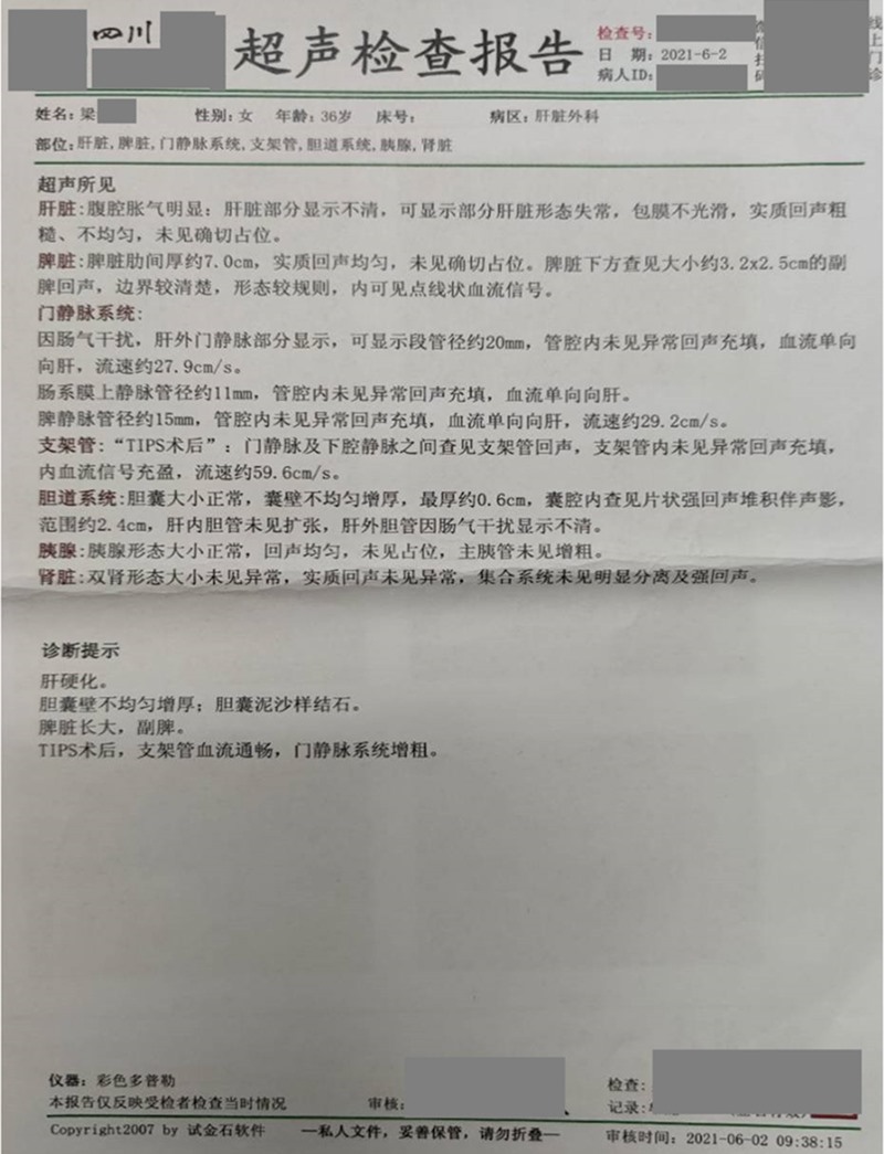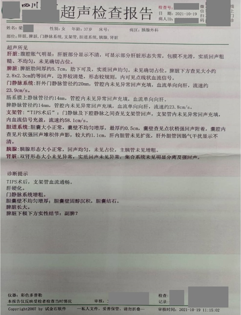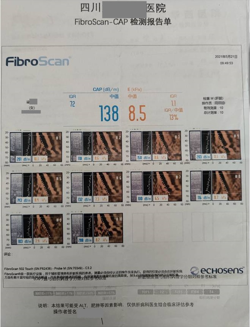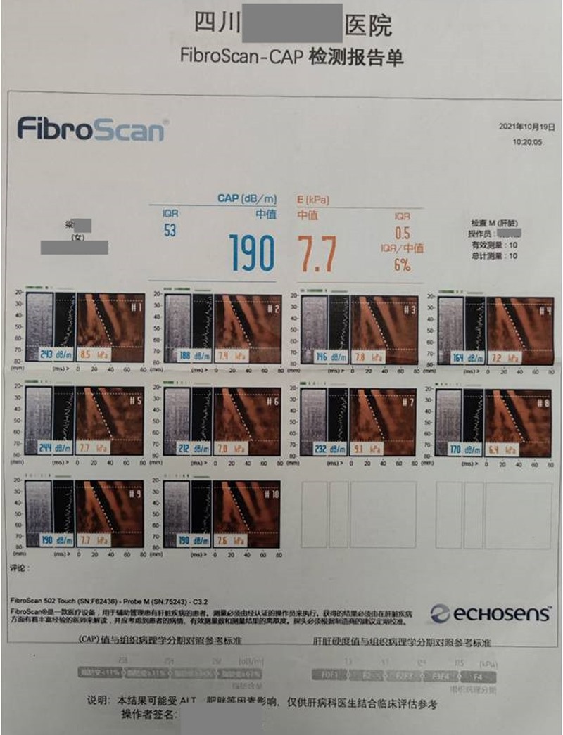 用藥前患者臨床診斷為肝硬化,脾臟腫大。確診肝硬化后的幾年間,患者采取多種治療方式,并調(diào)節(jié)飲食,肝硬度指標(biāo)有逐年好轉(zhuǎn)的趨勢,但硬度仍處于較高數(shù)值。單獨使用注射用綠原酸1個月后,肝硬度指標(biāo)好轉(zhuǎn)(8.5→7.7),而且一直沒法解決的脾臟腫大問題,也得到了改善,脾臟厚度變?。?.0cm→5.7cm)。患者持續(xù)用藥至今,生活質(zhì)量得到較大改善,自我感覺精力變好,睡眠改善,食欲增強,手指腫脹也基本消失。