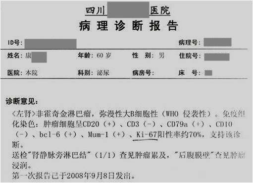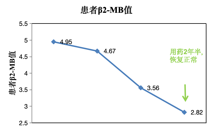 用藥前病理診斷報告為<左腎>非霍奇金淋巴瘤,患者進行化療聯(lián)合使用注射用綠原酸,5個月后復查,未見復發(fā)。用藥2年半期間,腫瘤標志物血β2微球蛋白(β2-MB)值下降至正常。治療期間,注射用綠原酸與化療長期配合使用控制病情。安全性良好,明顯改善化療毒副反應。