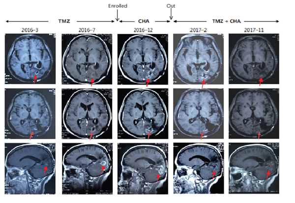 使用注射用綠原酸后病情得到有效控制,出組后再次使用替莫唑胺治療,MRI結(jié)果顯示替莫唑胺再次起效。