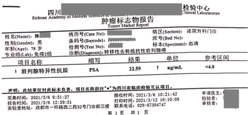 用藥前,患者診斷為前列腺惡性腫瘤,腫瘤標(biāo)志物前列腺特異性抗原高達(dá)100以上。隨后聯(lián)合注射用綠原酸和抗前列腺癌藥物治療。用藥1年7個月期間,前列腺特異性抗原逐漸下降至22.59,生活質(zhì)量改善。22年1月因新冠去世。