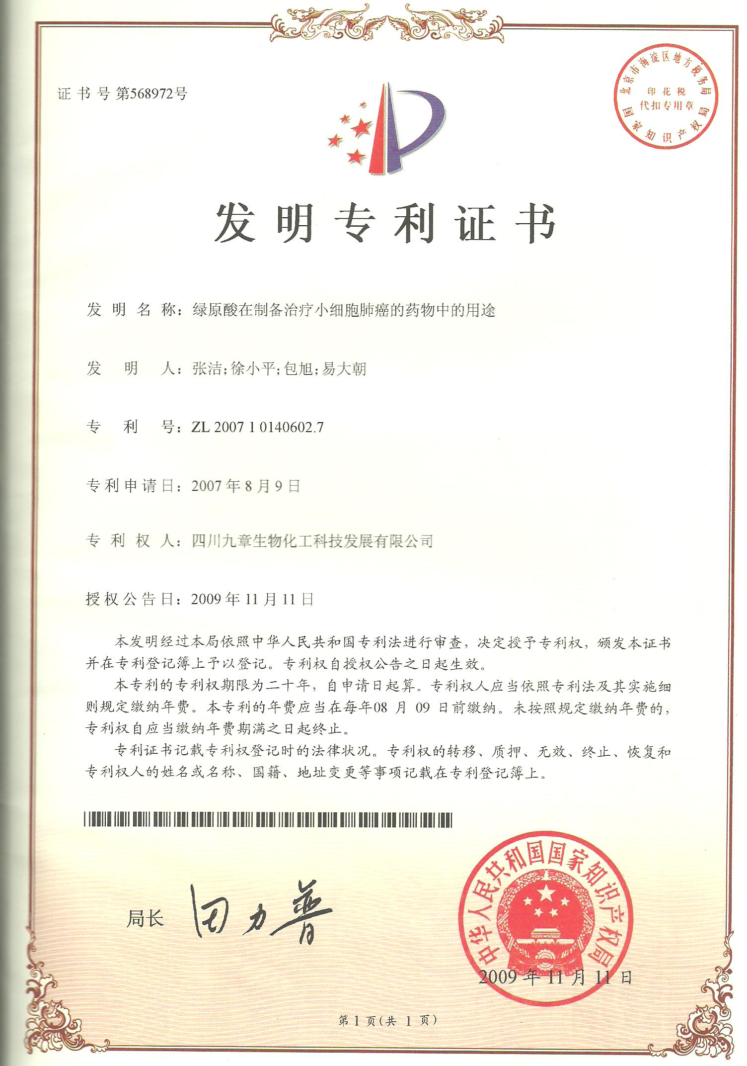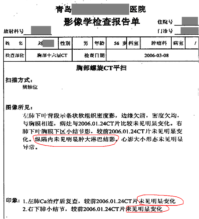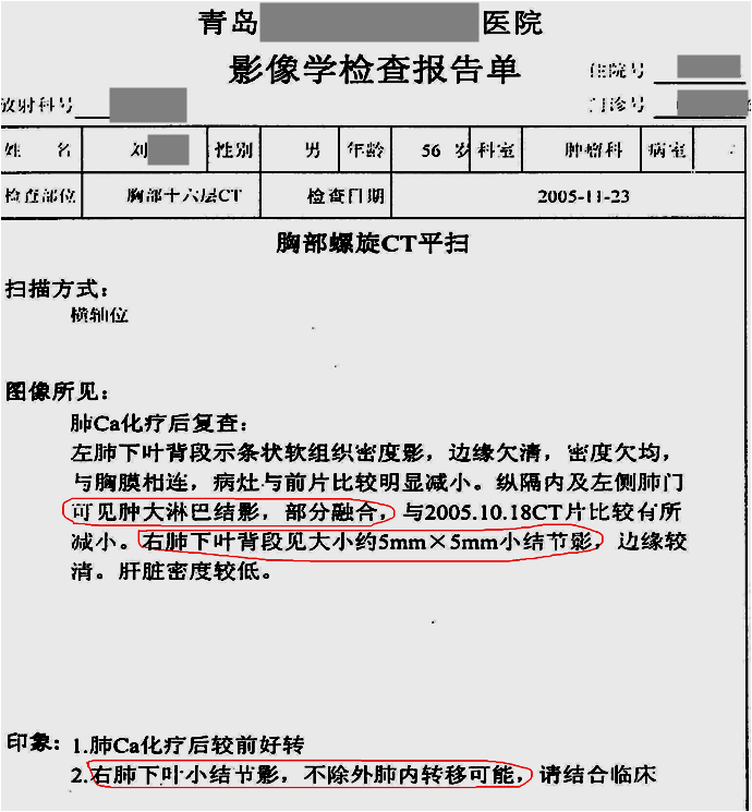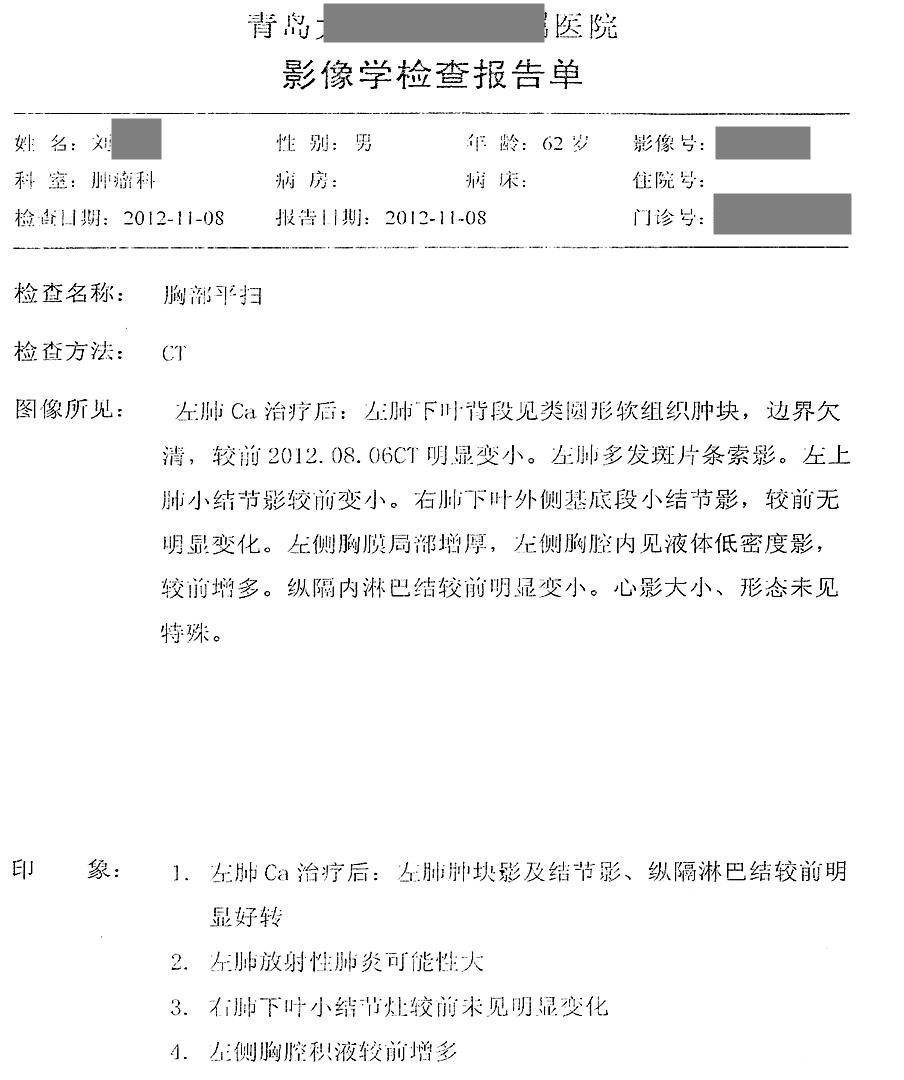 用藥前患者確診為左側(cè)小細(xì)胞肺癌,由于靠近血管無(wú)法手術(shù),只進(jìn)行化療,期間胸部CT發(fā)現(xiàn)有肺癌淋巴結(jié)轉(zhuǎn)移的可能,停止在醫(yī)院治療,隨后開(kāi)始單獨(dú)使用注射用綠原酸,沒(méi)有使用其他藥物。用藥3個(gè)月后,CT顯示轉(zhuǎn)移淋巴結(jié)病灶消失。用藥7年半,期間血生化指標(biāo)基本正常,腫瘤標(biāo)志物一直在正常范圍值內(nèi),病情穩(wěn)定,目前患者生活狀態(tài)良好,與常人無(wú)異,已延長(zhǎng)生存期13年。